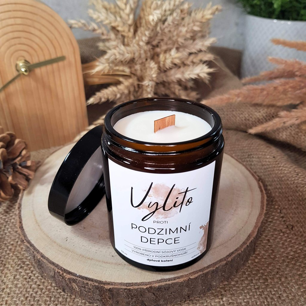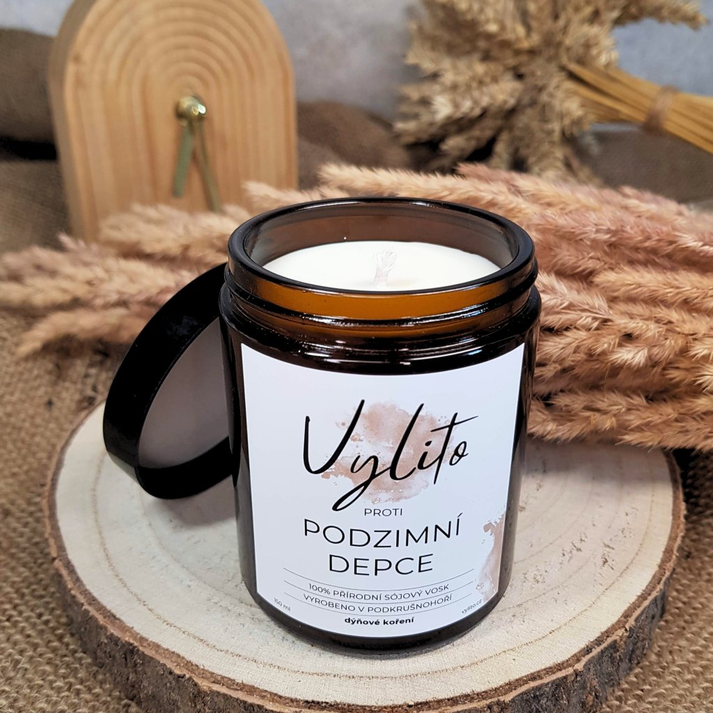 Vylito proti podzimní depce - Sójová svíčka vhodná pro lepší snášení pošmourného podzimu. Vyzkoušeno a působí dokonale - aktuálně je léto, za oknem 30 stupňů a já už se těším na podzim :-D